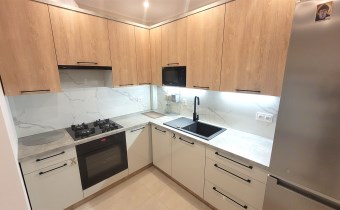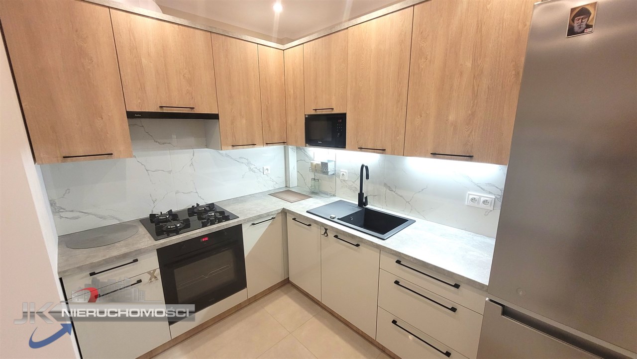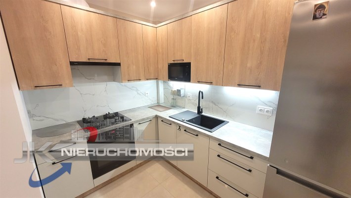 - zabudowa kuchenna ze sprzętem AGD (płyta gazowa, piekarnik, lodówka, zmywarka, mikrofala) oraz podstawowe wyposażenie kuchni