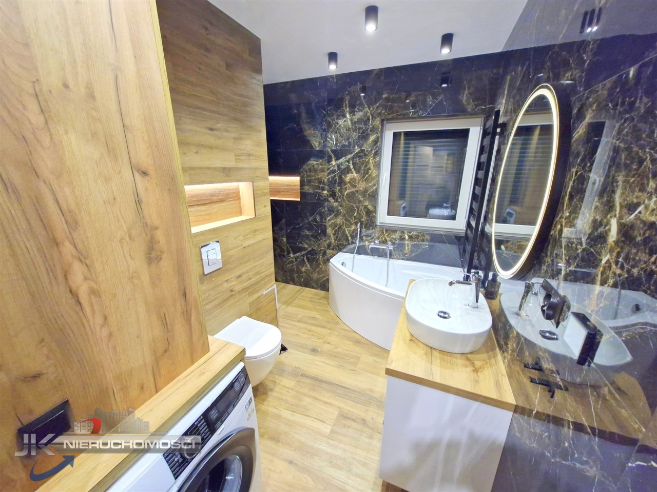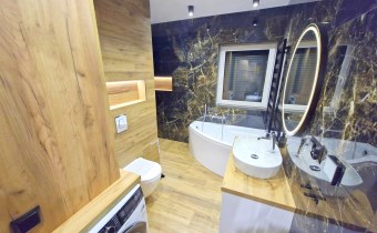 - łazienka wyposażona w prysznic, wannę oraz pralkę